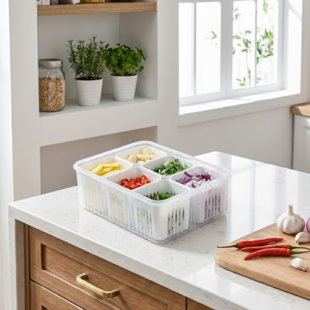 Transforme sua rotina com uma caixa prática, resistente e perfeita para armazenar alho, cebola, gengibre, temperos e pequenos alimentos. Com 6 compartimentos (ou 4 divisórias configuráveis), você separa tudo com facilidade e evita misturas de odores.